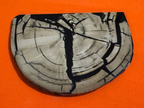 This striking piece is a genuine Fossil Mammoth Ivory tusk cross-section, expertly cut into a distinct half-round or D-shape and polished to a high sheen. It clearly displays the natural concentric growth rings and the characteristic intricate patterns of mammoth ivory. The bold, dark lines of the stabilized cracks provide a dramatic contrast against the classic creamy ivory backdrop, highlighting the material's immense age and unique history. A fascinating segment of natural history, perfect for display, collection, or unique crafting projects.