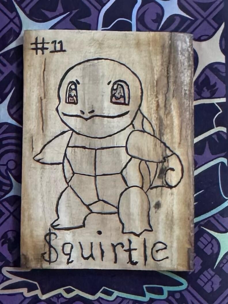 A truly unique fusion of pop culture and natural history, this collectible card features the beloved Pokemon Squirtle (#11) meticulously hand-carved onto genuine Fossil Mammoth Ivory. The natural grain and warm tones of the ancient ivory provide a distinctive backdrop for the iconic character design. This rare piece showcases exceptional craftsmanship, transforming a piece of the Ice Age into a one-of-a-kind tribute. A must-have for discerning collectors of Pokemon memorabilia and unique natural materials.